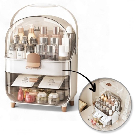 Zapomnij o bałaganie na półce czy w szufladzie! Nasz wielofunkcyjny organizer to idealne rozwiązanie dla osób ceniących porządek i elegancję. Jego uniwersalny design sprawia, że doskonale wpasuje się w każde wnętrze, dodając mu szyku i organizacji. Dzięki kilku przegródkom i pojemnikom bez trudu znajdziesz ulubiony cień do powiek czy pomadkę. Dodatkowo jego kompaktowe wymiary sprawią, że zmieści się nawet na niewielkiej przestrzeni. Organizer wykonany został z akrylu w modnym kolorze, dodatkowo elementy w kolorze złotym sprawiają, że produkt prezentuje się ekskluzywnie. Przeźroczyste wieko pozwala z łatwością odnaleźć potrzebny kosmetyk.